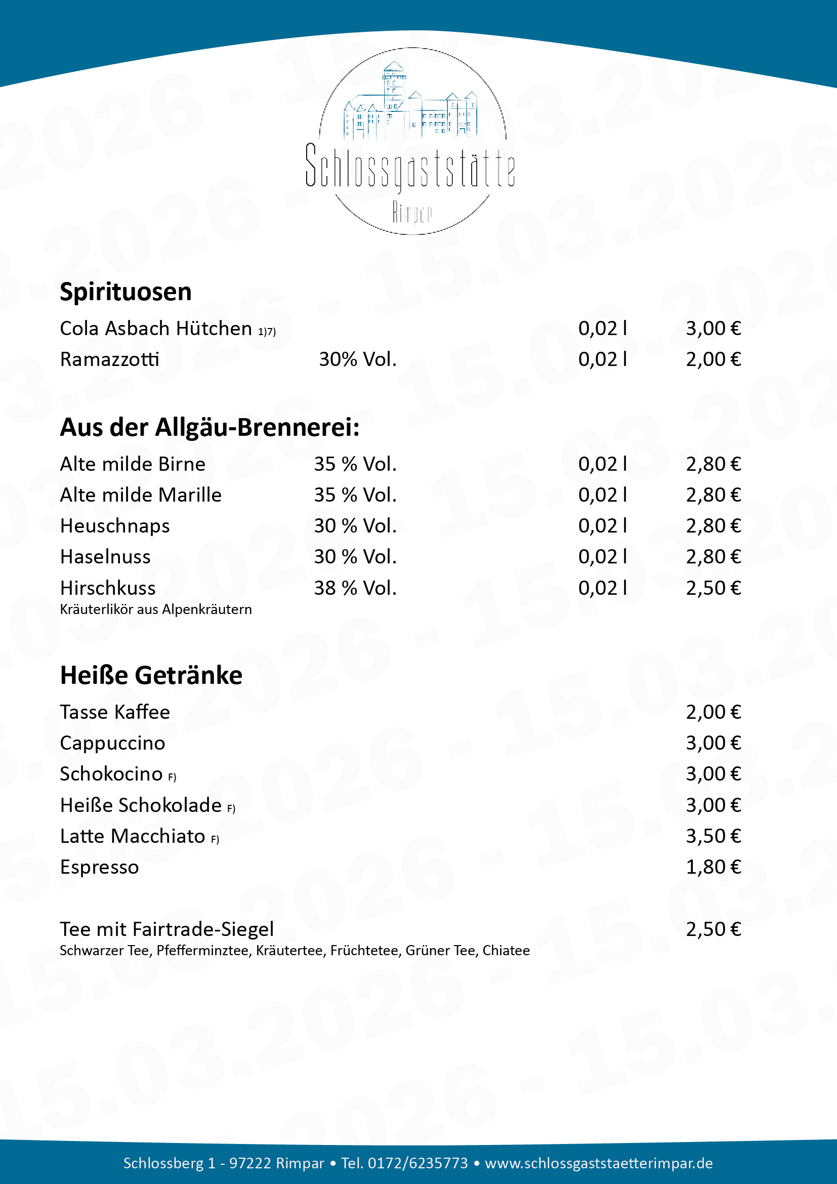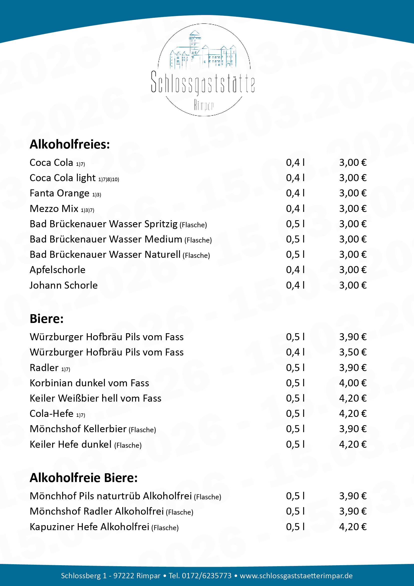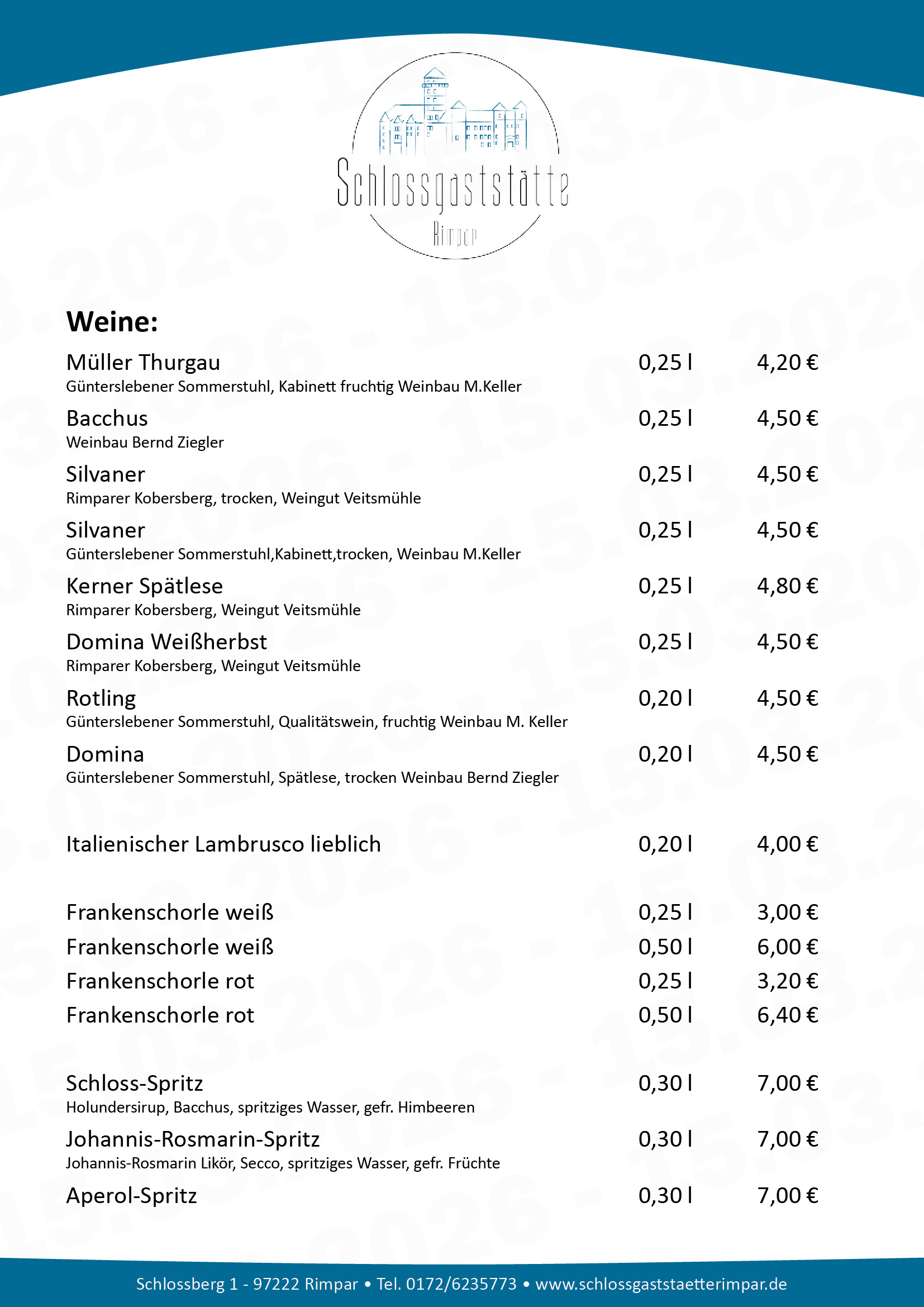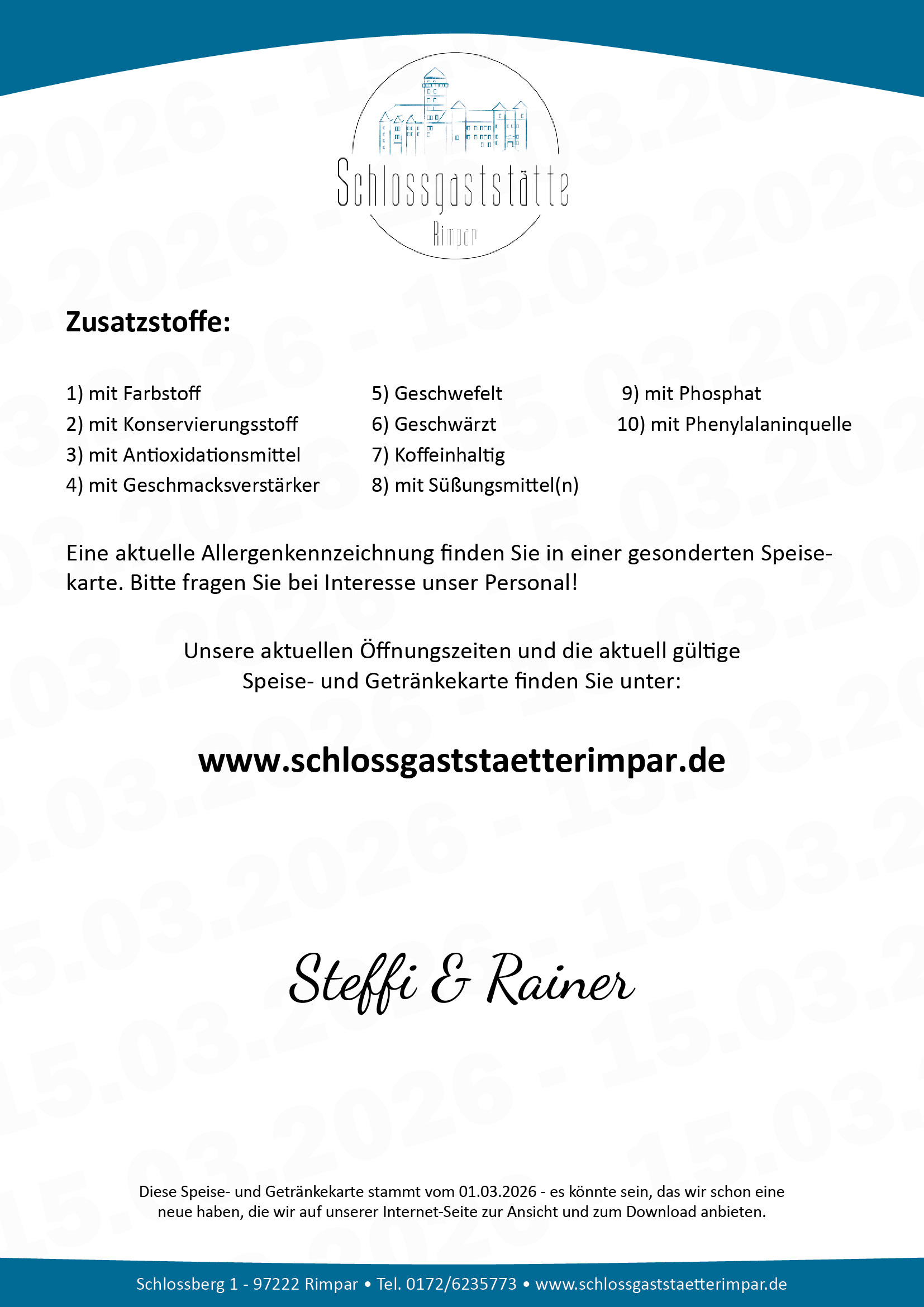 Schlossgaststätte Rimpar - Unsere aktuelle Speisekarte
